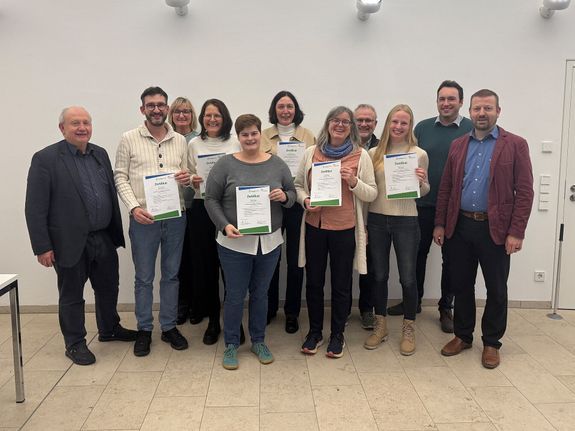 12.12.2025 - Würzburg (POW) Fünf Frauen und ein Mann aus dem Bistum Würzburg haben den Ausbildungskurs zu kirchlichen Umweltauditor(inn)en für EMAS beziehungsweise den Grünen Gockel erfolgreich abgeschlossen. Das teilt die Fachstelle Schöpfungsverantwortung und Klimaschutz des Bistums Würzburg mit. Bei einer Segensfeier im Würzburger Burkardushaus überreichte Domkapitular Albin Krämer, Bischofsvikar für den Katholikentag, die Zertifikate an Sindi Juskevic (Martinushaus Aschaffenburg), Karin Reitelbach (Dekanatsbüro Bad Kissingen), Markus Saukel (Kilianeum Würzburg), Elke Schüller-Wirsing (Dekanatsbüro Bad Kissingen), Daniela Stenger (Dekanatsbüro Aschaffenburg) und Katharina Stoß (Tagungszentrum Schmerlenbach).